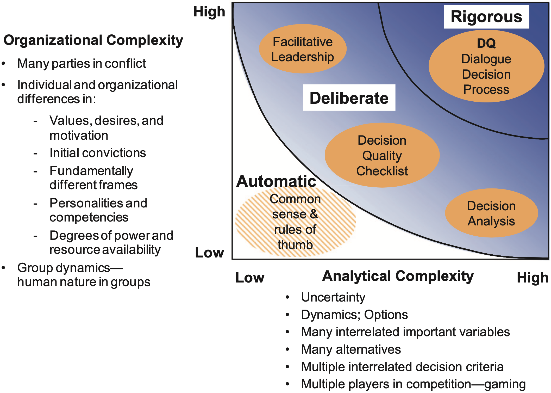 In spite of its importance, decision quality is rarely taught formally. This is a shame! Some of reasons include the organizational and analytical complexity of decision making. Figure 1 depicts how decision professionals tackle and manage these two dimensions. To address analytical complexity, this site focuses on decision modeling (aka, decision analysis) using popular data science programming languages such as Julia, Python, and R.